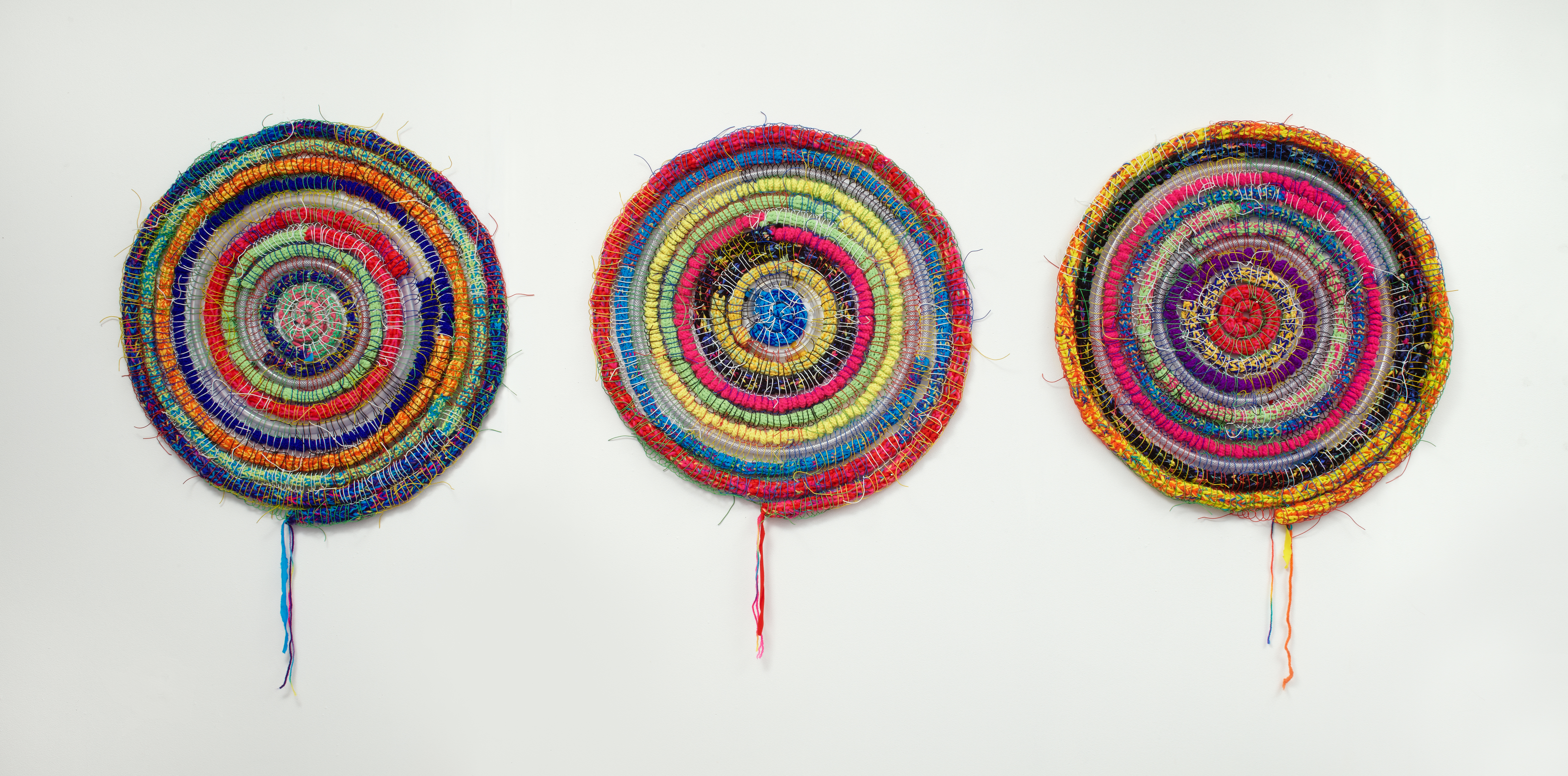Using the spool knitting technique also known as French knitting, the artist made a series of artworks with knitted tubes assembled in spirals. A wide range of yarns were knitted, woven with plastic tubing and wire. Theses artworks aimed to celebrate the joy of making in the everyday.