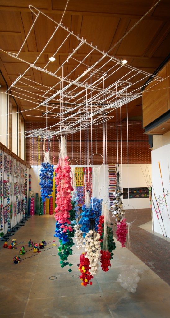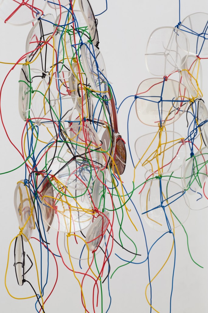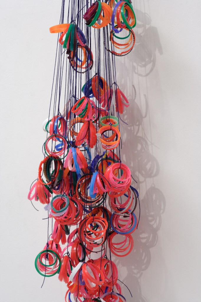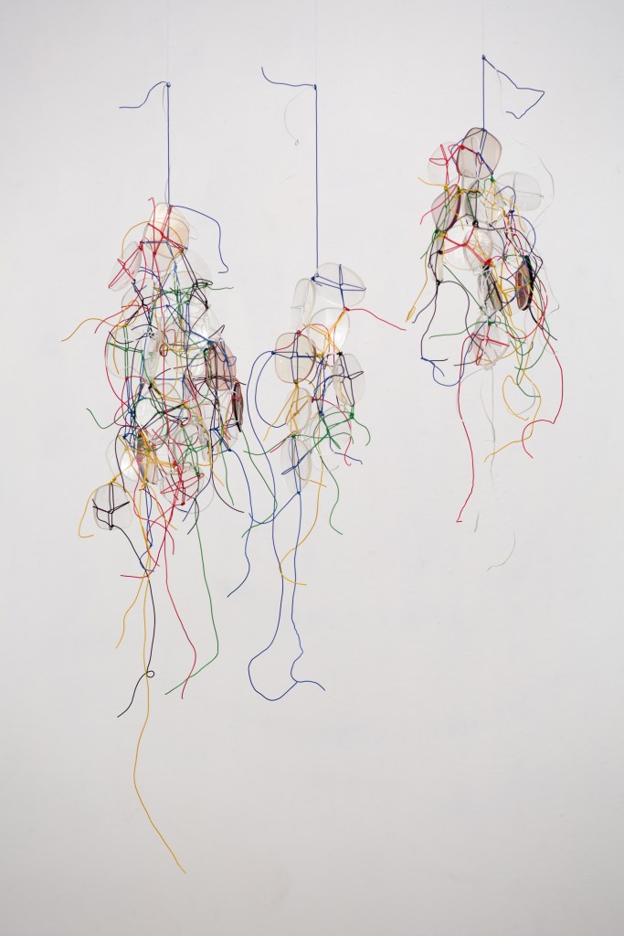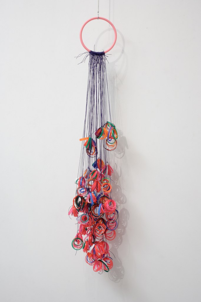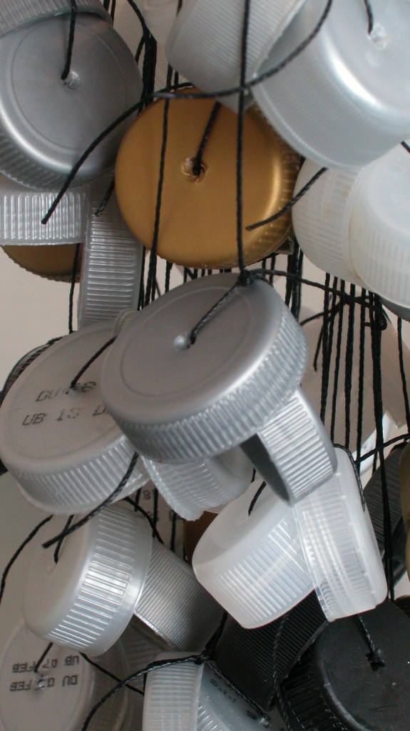 Rings, 2009. Hanging installation. Photo © FXP Photography, London Plastic bottle top rings, whipping twine, bag plastic handle. 1m x 0m20 W x 0m16 D.