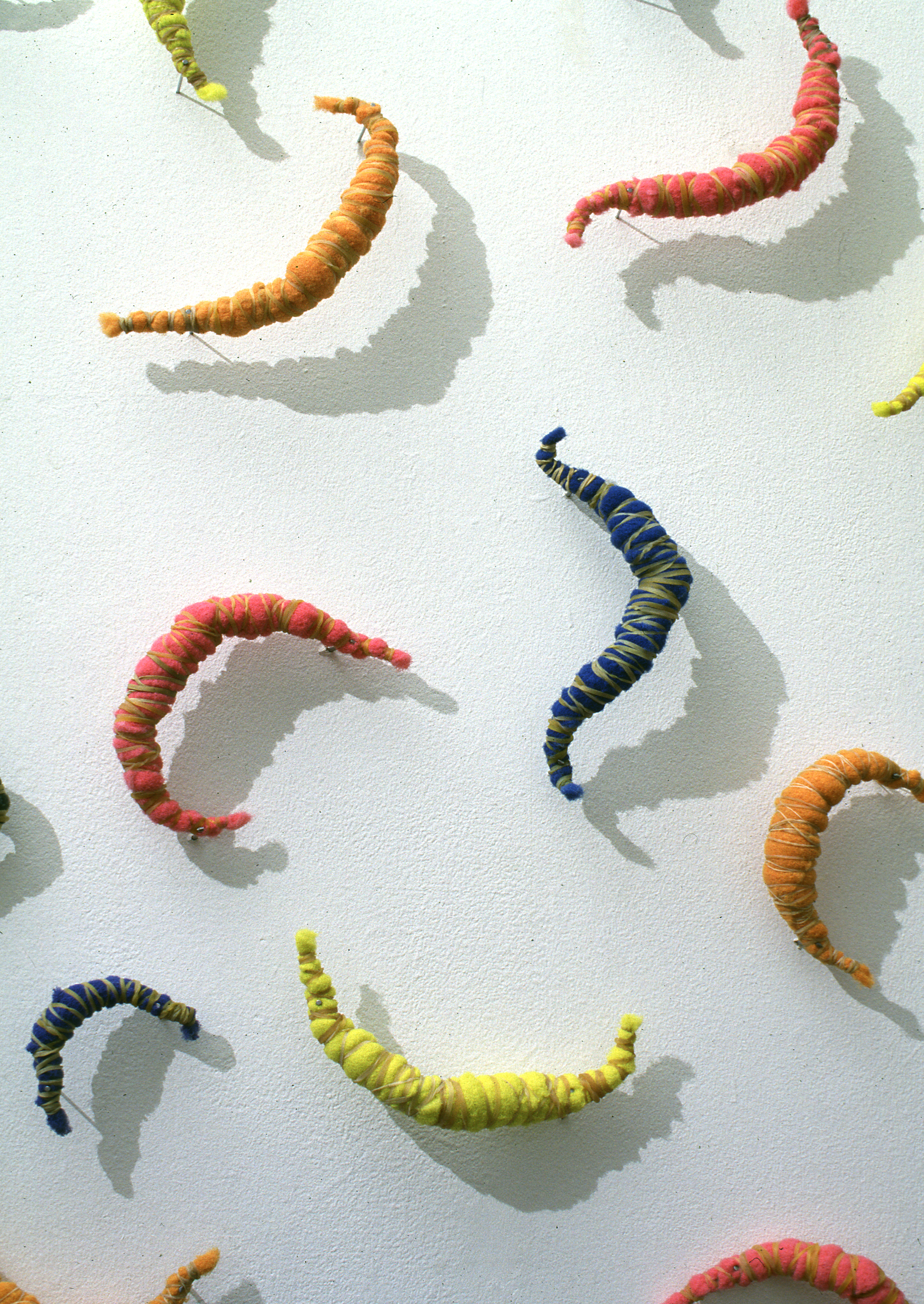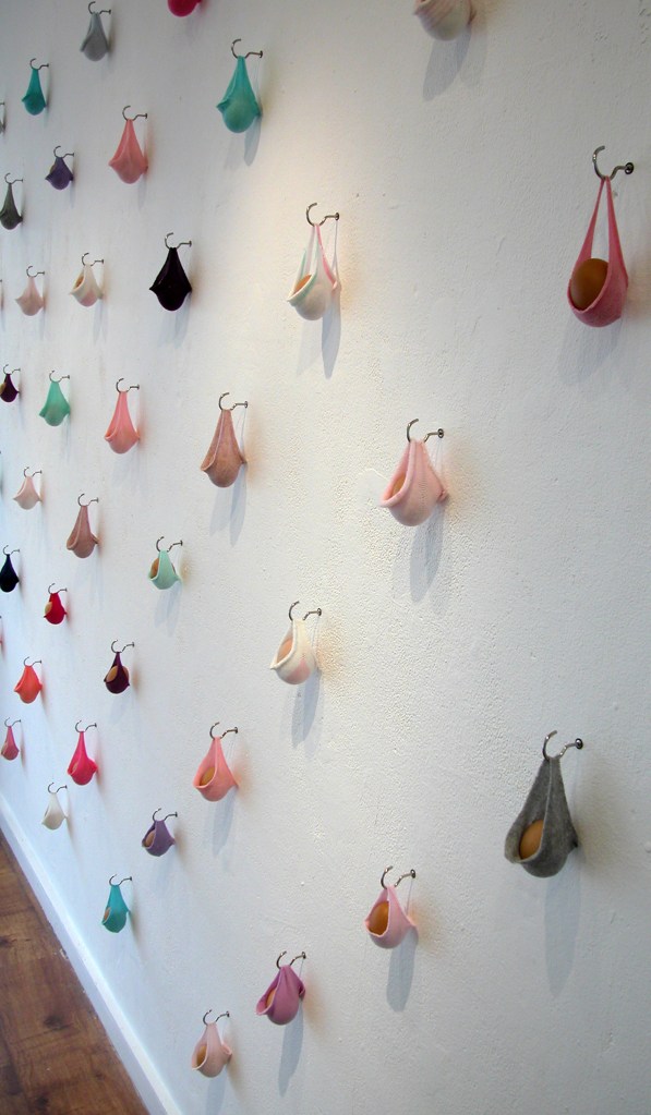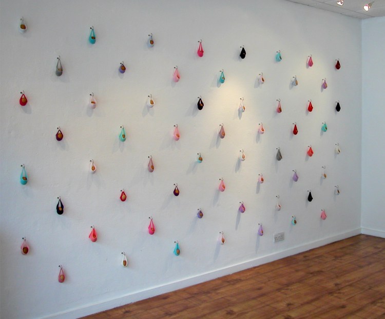 Inspired by Michel de Certeau concept of art of making in the everyday, the installations have for origin everyday objects. They are made of washing up gloves, scouring pads, bottle tops, children socks. The objects have been simply manipulated, yet the transformation is uncomplete, function and familiarity remaining recognisable.