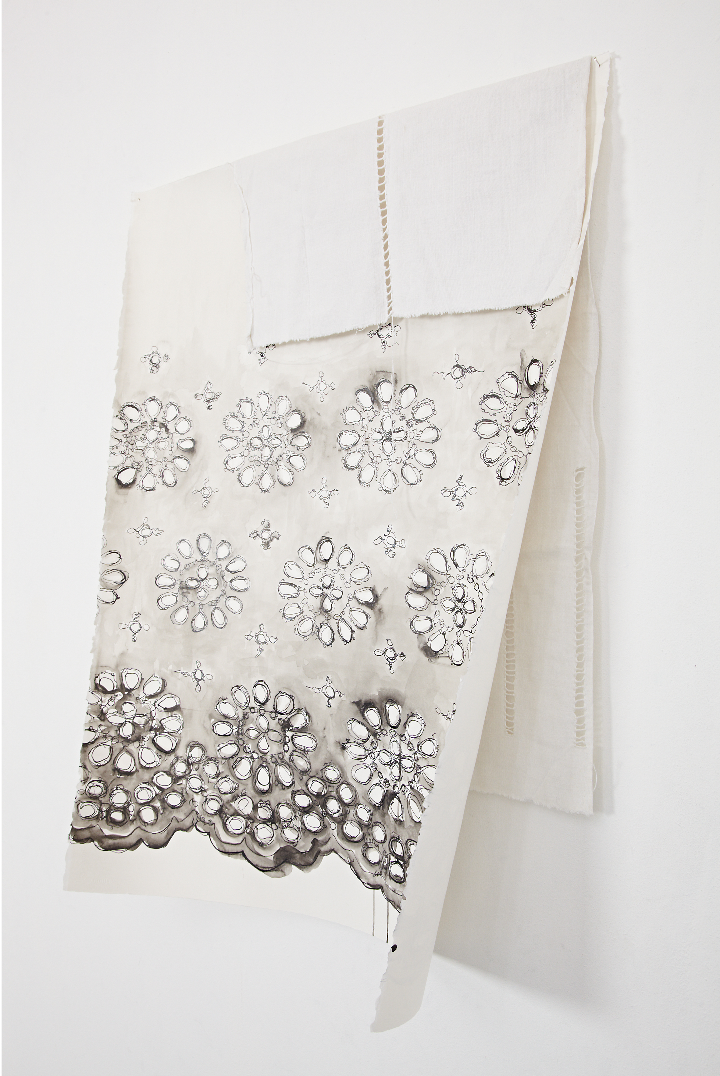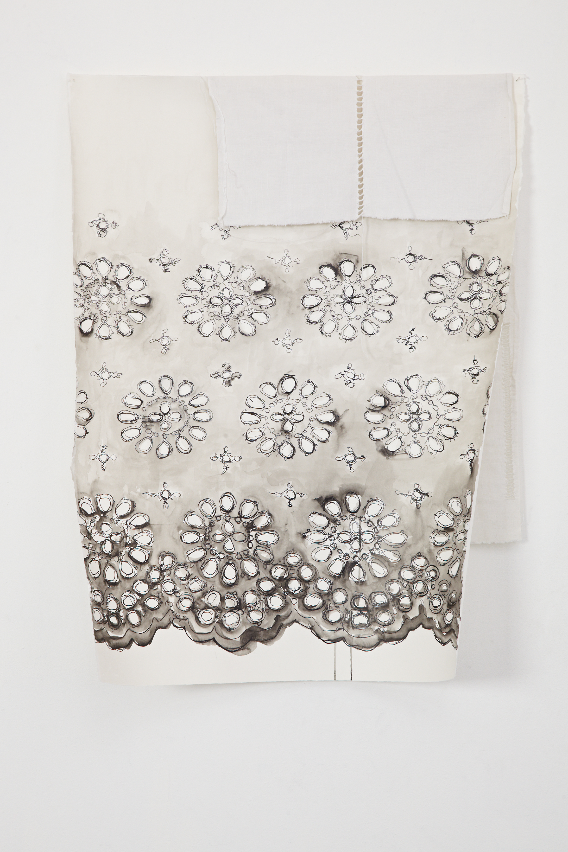 Broderie anglaise brings together a series of drawings and installations inspired by machine-made openwork embroidery trimmings belonging to the artist’s mother. The white cotton trimming would have been used to ornate plain linen such as pillowcases, bonnets and undergarment. The white on white embroidery, projected and enlarged on paper has become a motif the artist often returns to and draws.