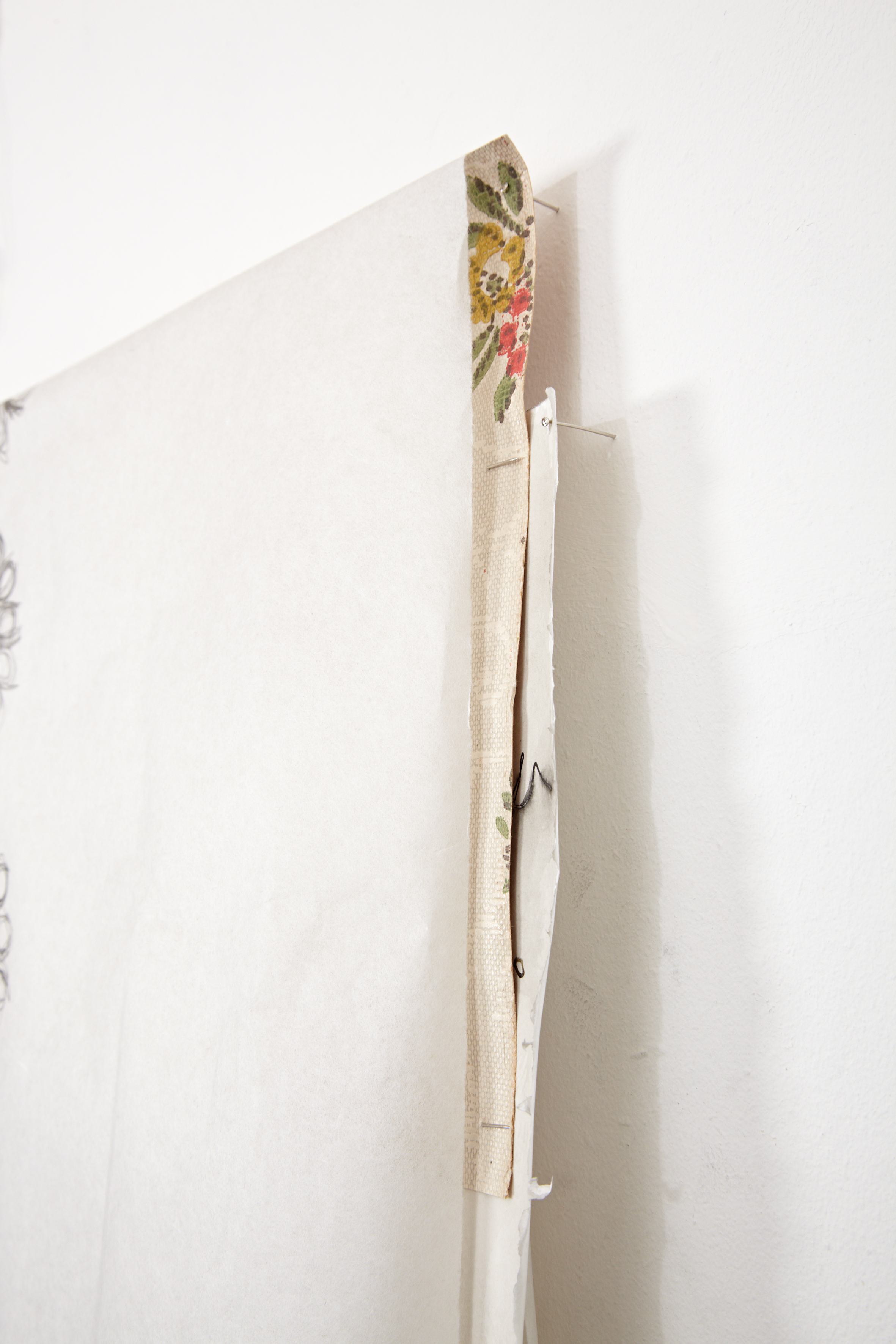 à l’anglaise (Madeira), 2018. Installation detail. Washi (Japanese paper) Kozo (mulberry); Arches watercolour cotton paper; shellac gum ink; pencil; acrylic paint; linen napkins; mid-20th century wall paper; polyester, silk and linen threads; white glass-headed steel pins; plastic head quilting steel pins; dressmaking steel pins; glass and copper shaped chandelier pieces; tin/copper wire thread; wood, nickel and plastic curtain rings; dowel pine rod.