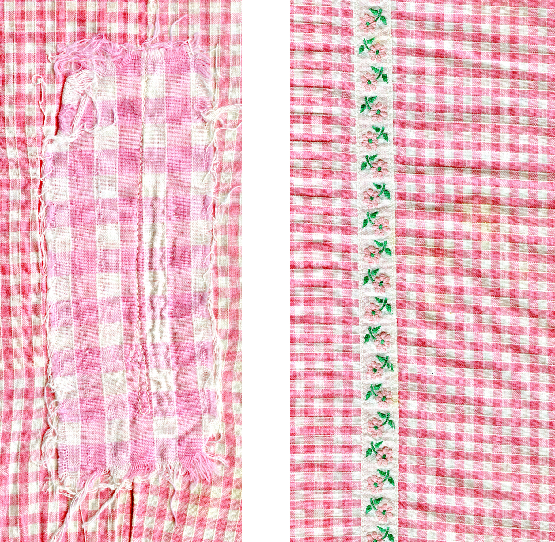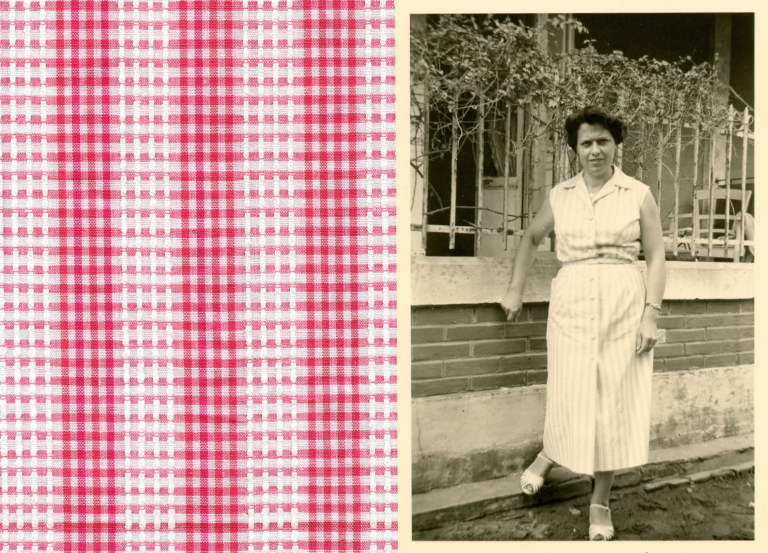 Carreaux normand is a popular woven fabric with a red, white and black checkerboard design. The gingham, called vichy normand, is used in France for tablecloth and napkins. Gingham fabrics such as the carreaux normand and the fine pink cotton gingham/vichy or guingan were often used by the artist’s mother, Paulette Dupré (née Berthelot).