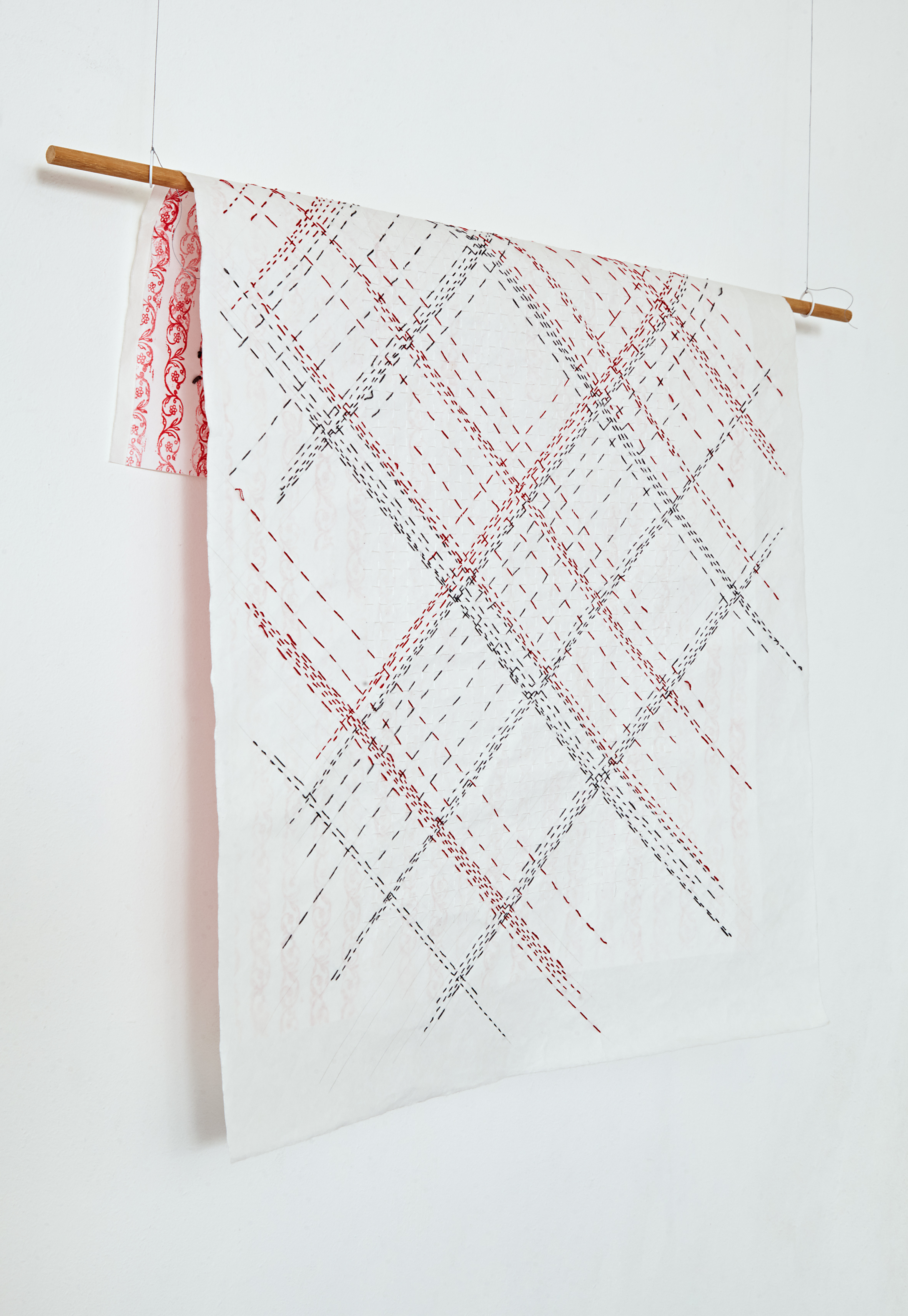 Carreaux normands, 2019. Wall installation. Stitch: Running stitch/Point devant. Washi (Japanese paper), Kozo (mulberry); DMC Mouliné Spécial, stranded cotton embroidery thread; linen thread; dowel pine rod; white metal rings; ink printed motif transferred from early-20th century rubber cylinder. 0m70 H (variable) x 0m62 W x 0m08 D 1m70 H from floor