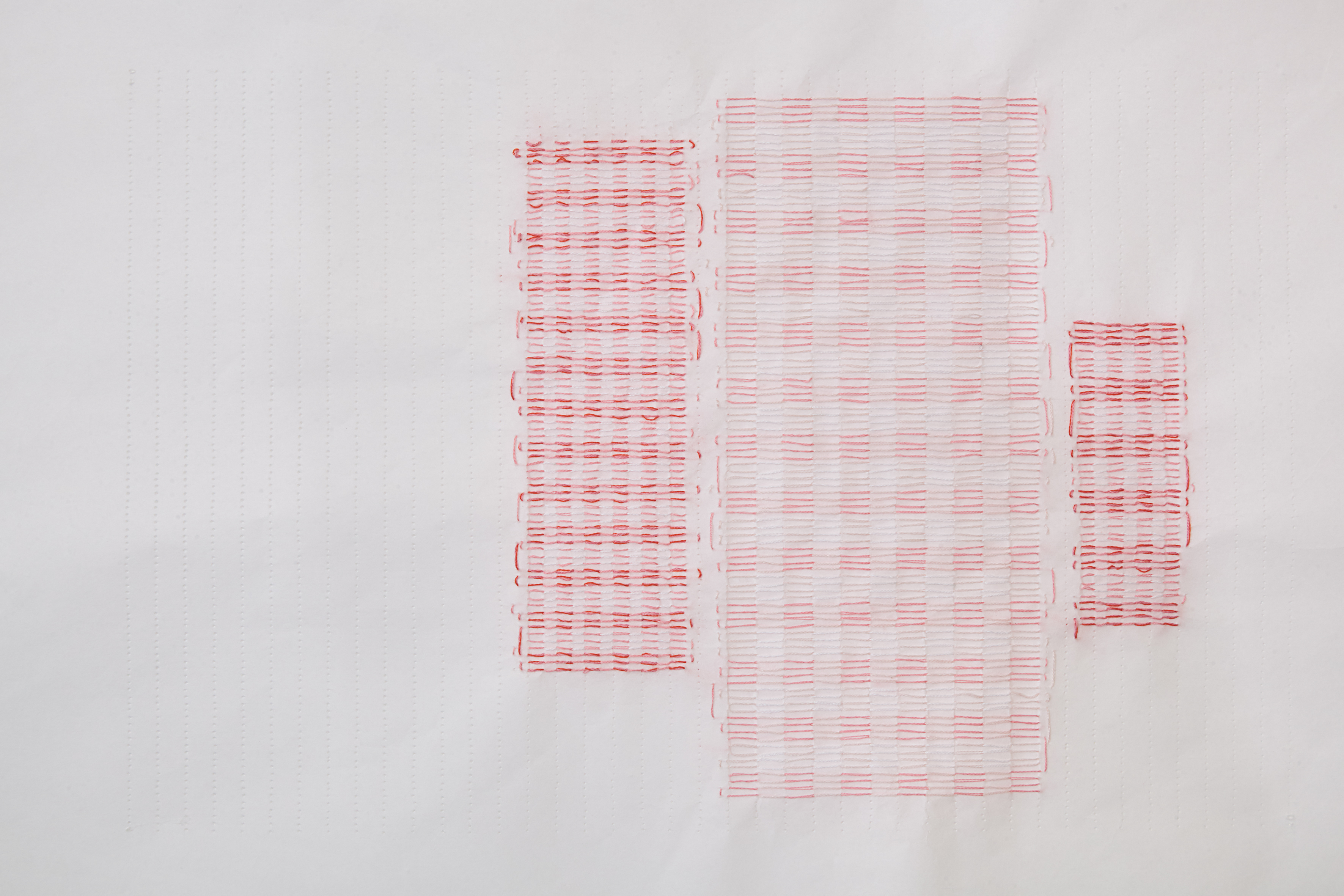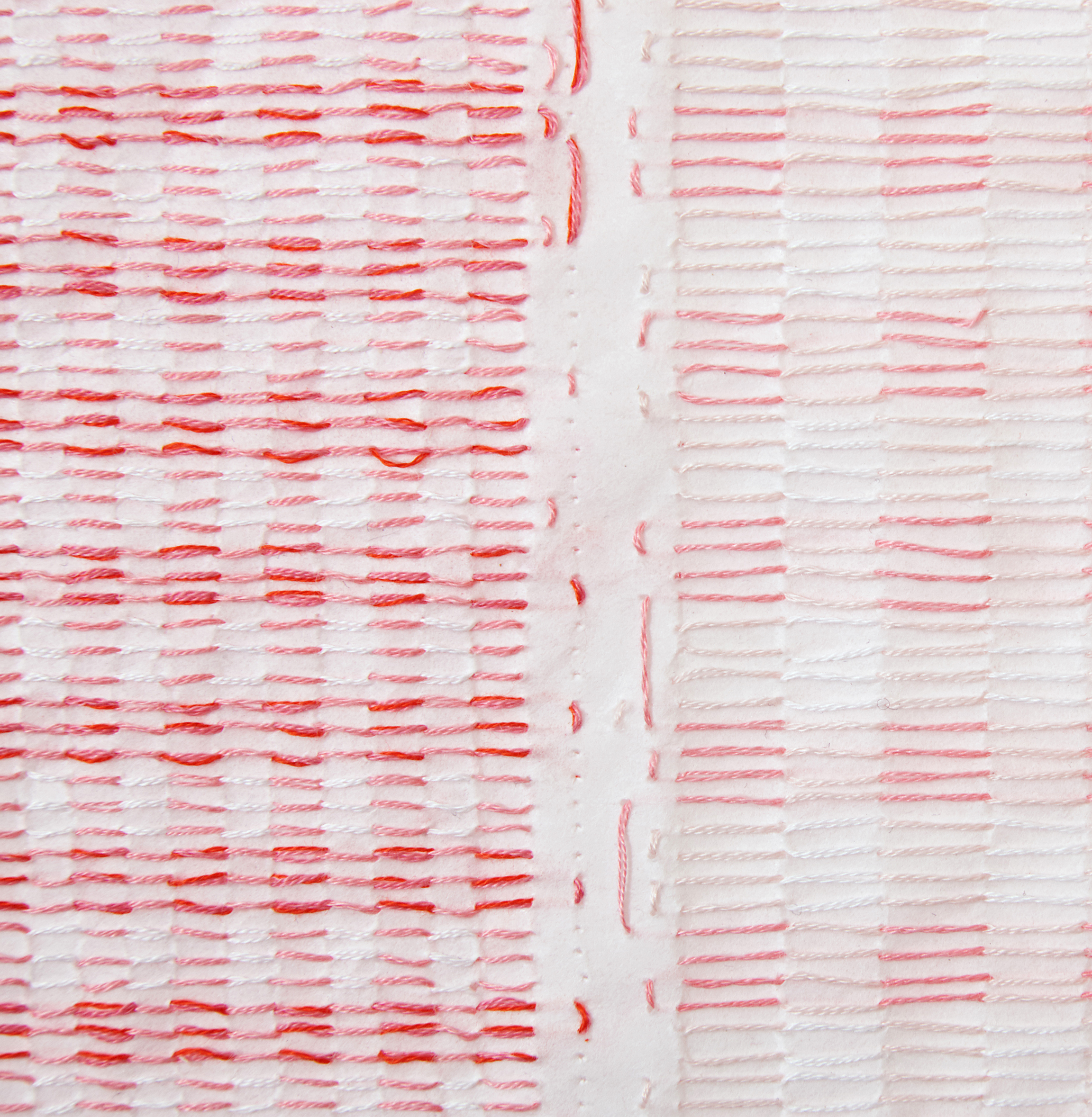 Vichy, Paulette, 2019. Wall piece. Stitch: Running stitch/Point devant. Washi (Japanese paper), Kozo (mulberry); DMC Mouliné Spécial, stranded cotton embroidery thread; dressmaking steel pins. 0m46 H x 0m62 W