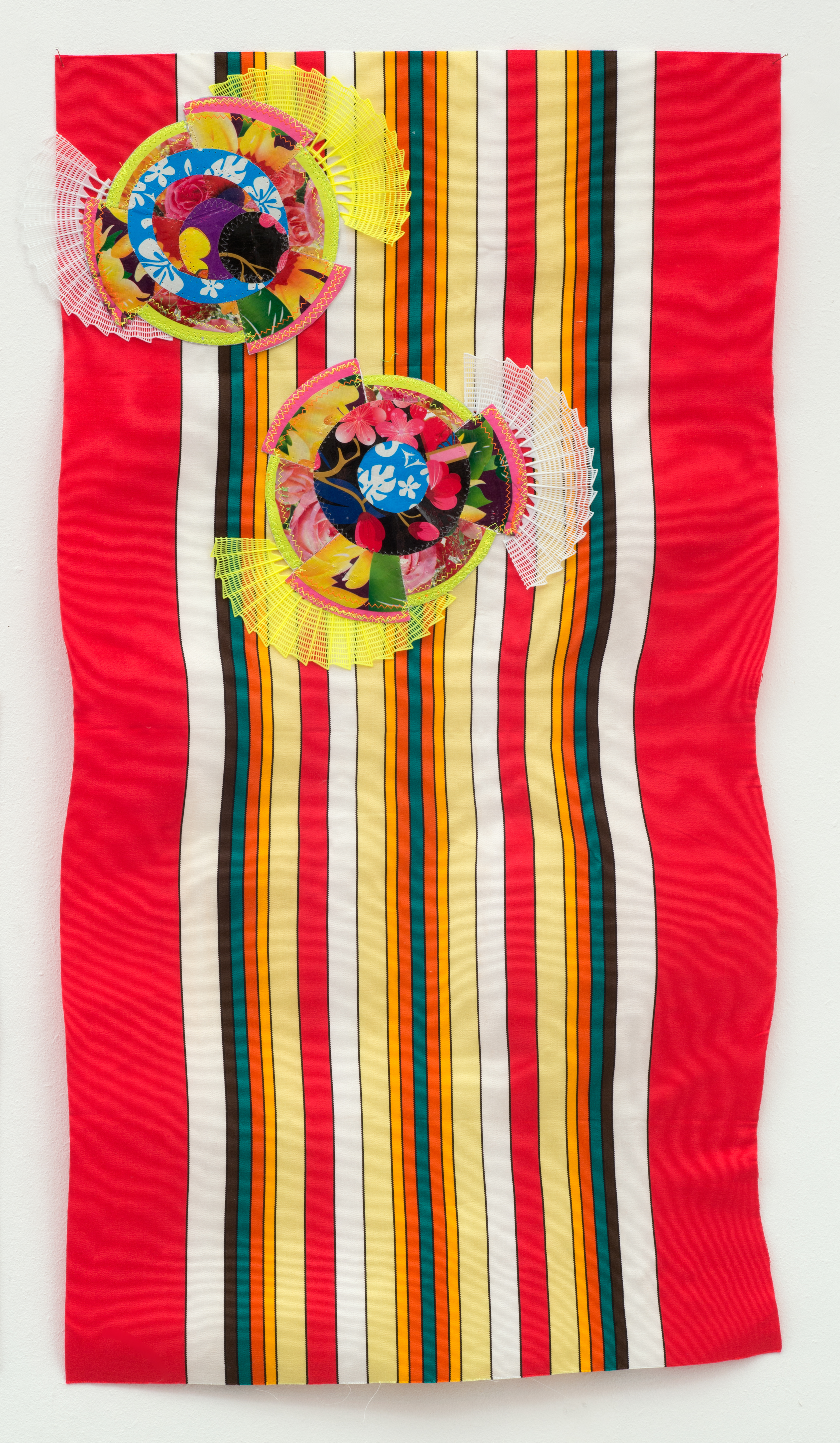 Chaise longue et volants, 2014. Wall piece. Deck chair canvas, Woven and printed carrier bags, shuttlecocks, pins. 0m80 H x 0m50 W x 2cm D.