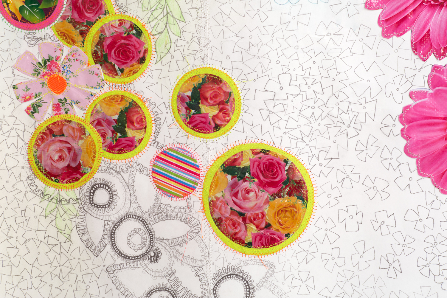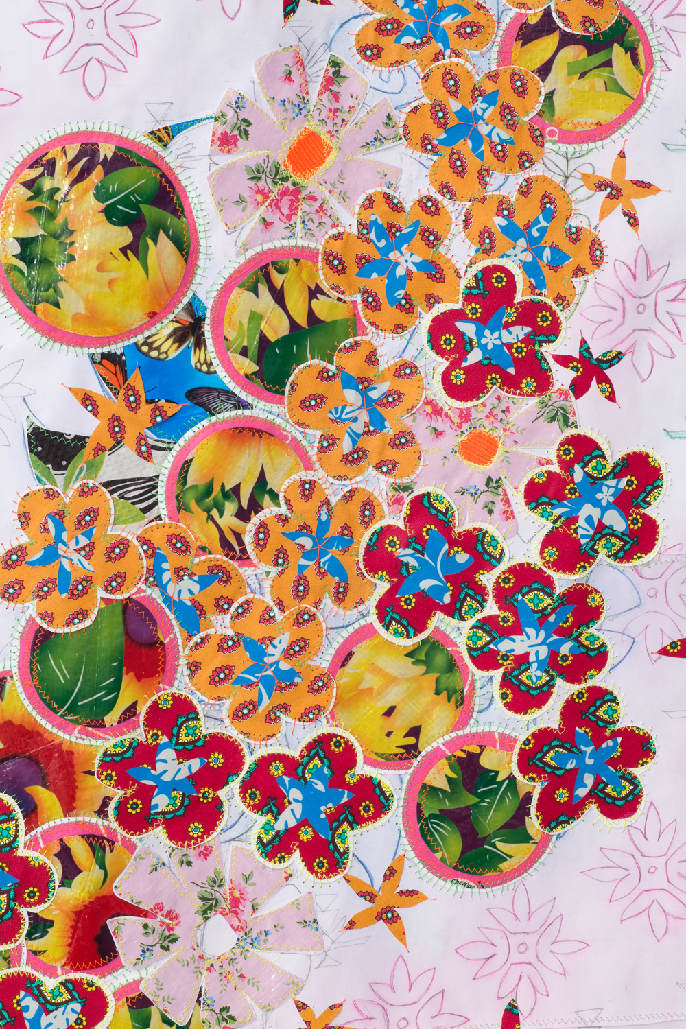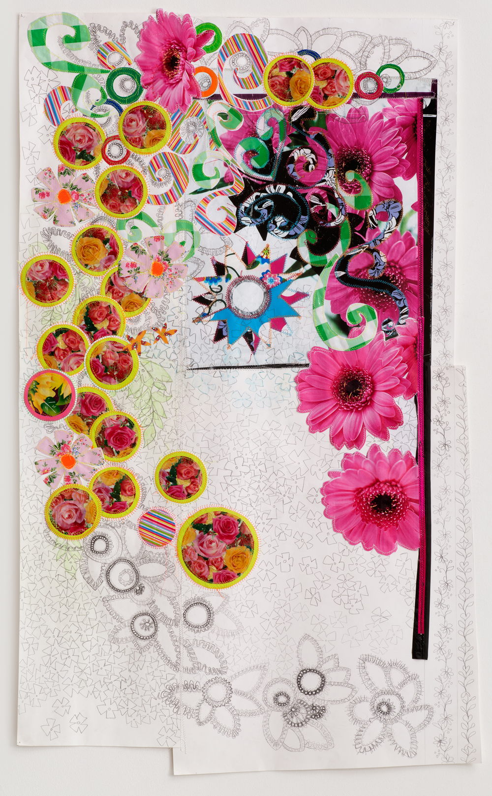 Floating Islands (with star), 2014. Paper-based stitched drawing. Woven and printed carrier bags, lead pencil, water color pencil, thread on paper. 1m29 H x 0m77 W x 4cm D.