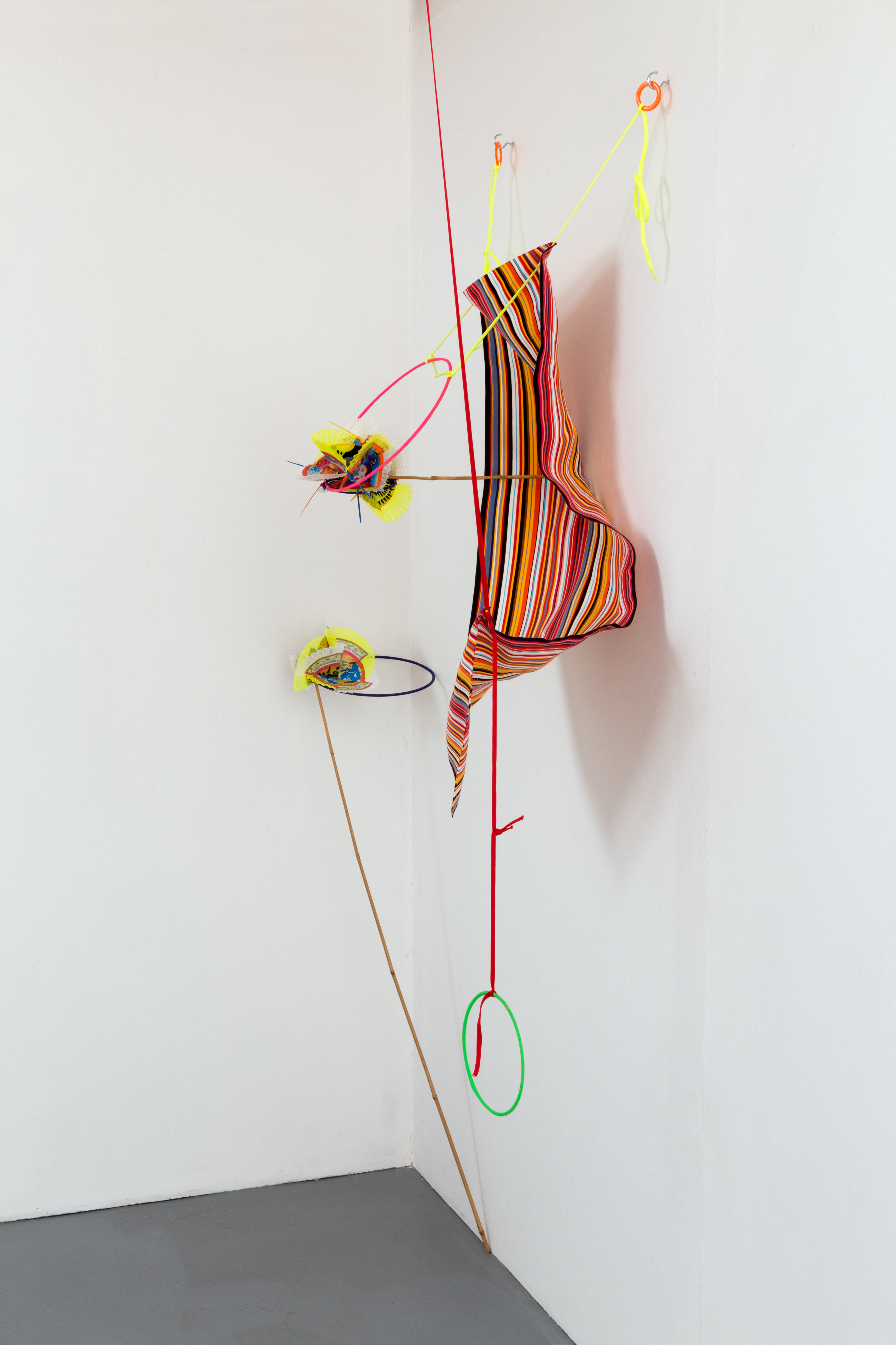 Chaise longue et volants, 2015. Corner installation. Deck chair canvas, Woven and printed carrier bags, shuttlecocks, pins, bamboo cane, hooks and plastic rings. 2m45 H x 1m60 W x 0m60 D.