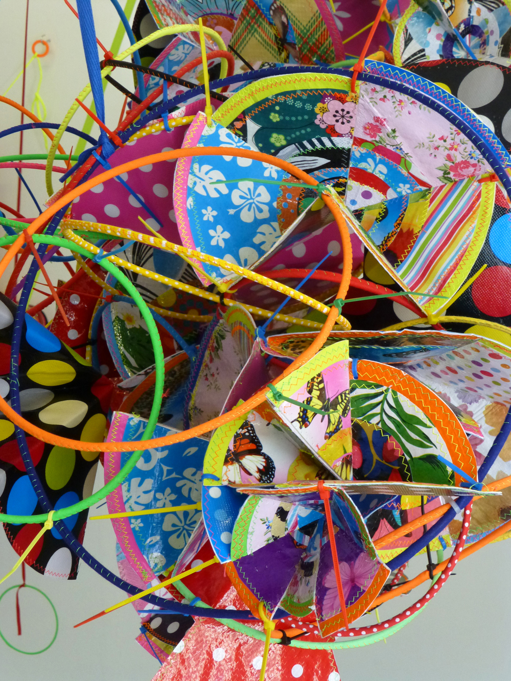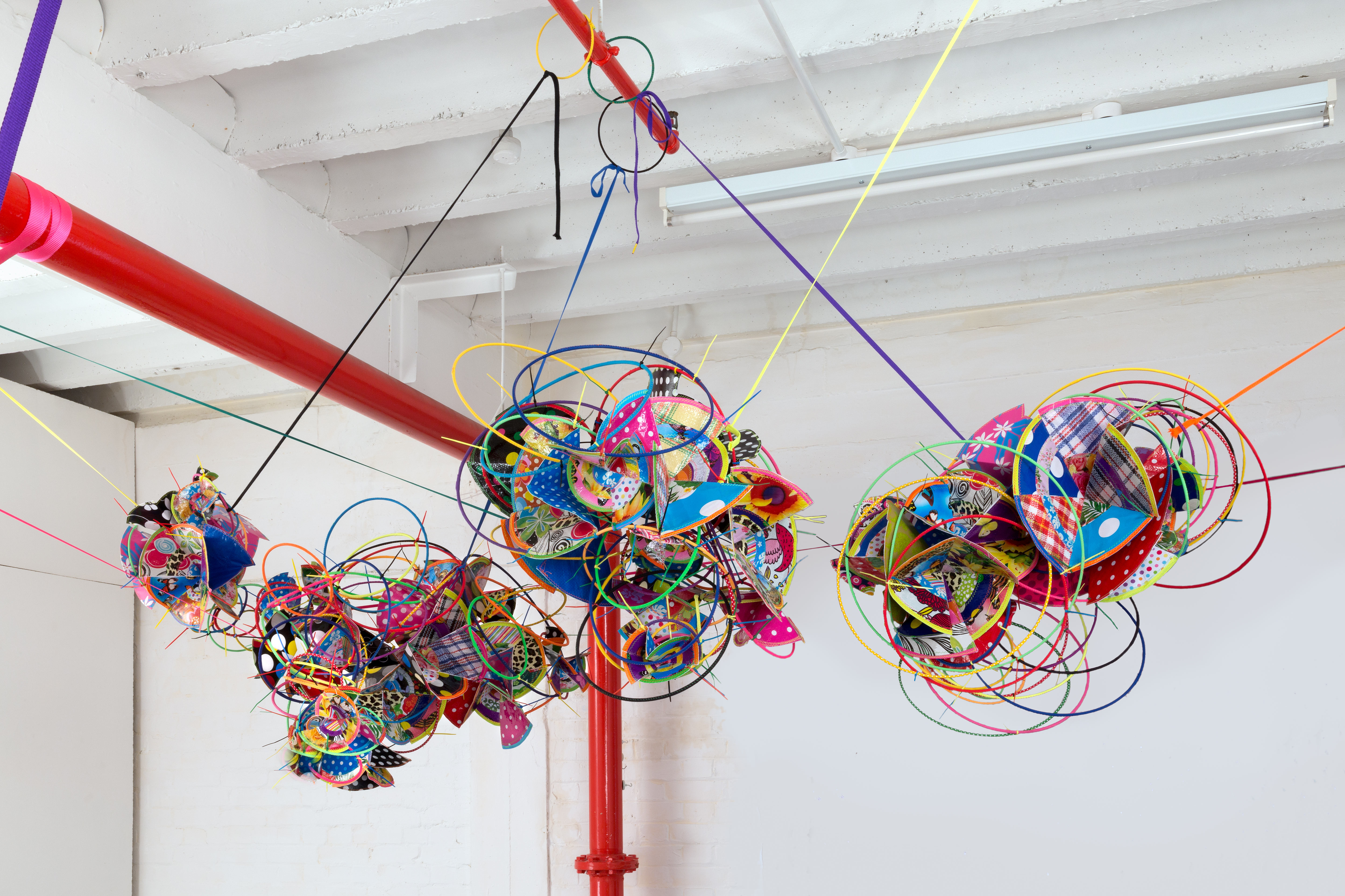 belles îles flottantes, 2015. Studio installation. Woven and printed carrier bags, bias, lamp shade metallic rings, cable ties, shoe laces and flat woven strapping. Variable configuration, 0m80 x 0m60 x 0m70, each group approximately.