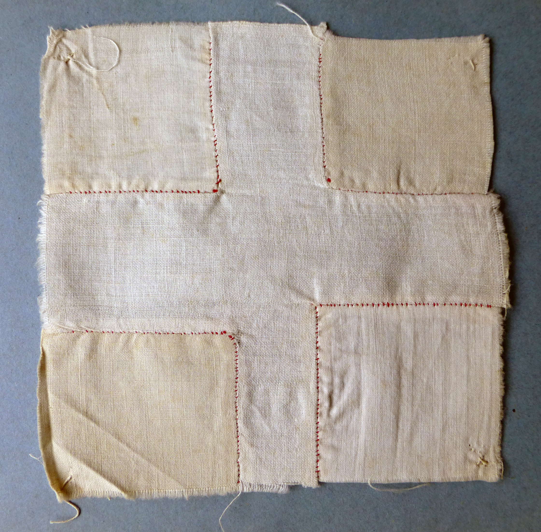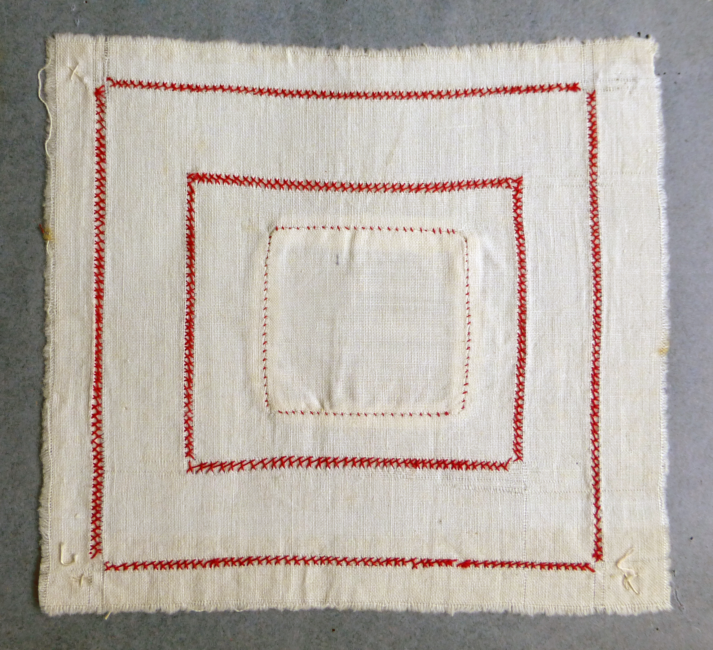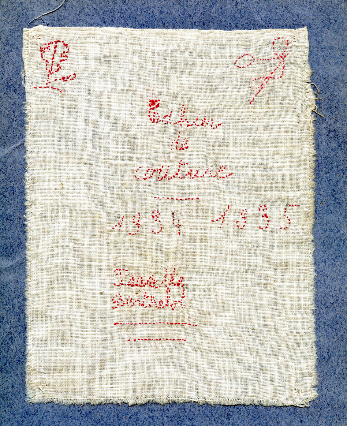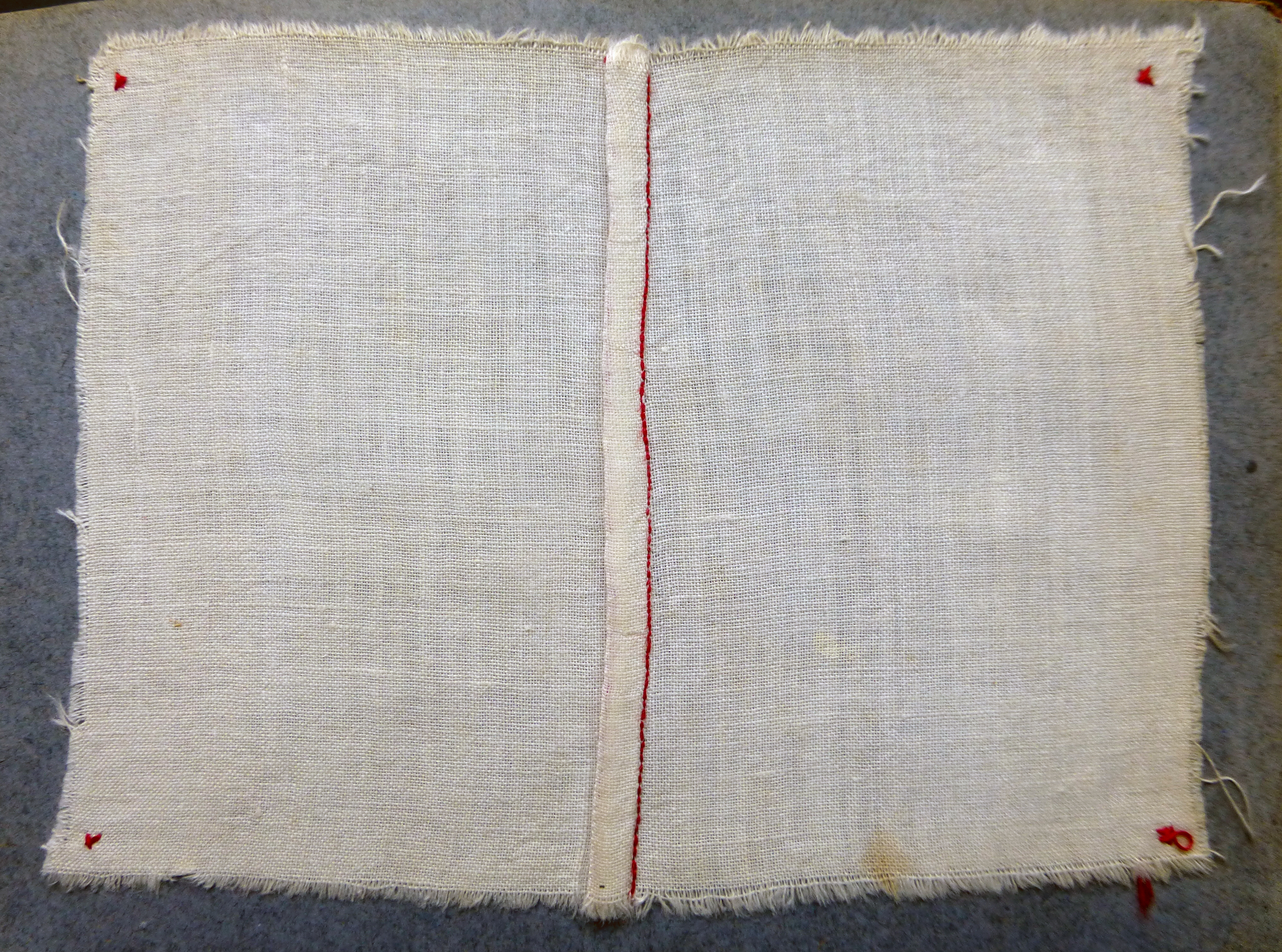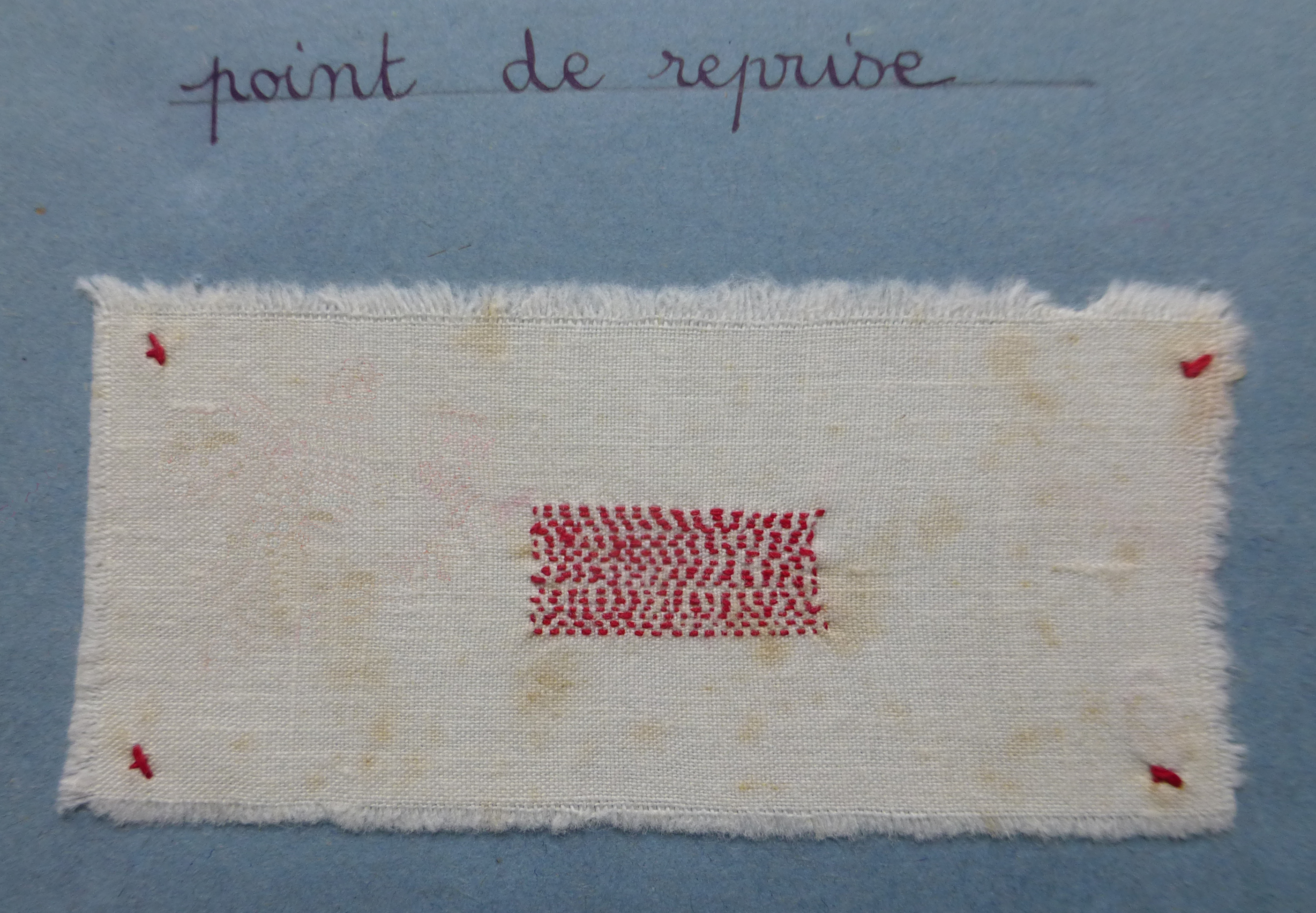 The project’s title Couture is borrowed from the front cover of two stitching exercise books/ cahiers de couture that belonged to the artist’s mother Paulette Dupré (née Berthelot, 1924-2011). The cahiers contain samplers, hand-stitched exercises done between 1934 and 1938 at school. The exercises focussed on plain sewing, basic stitches for joining, mending and finishing household linens. The stitches were executed with red cotton thread on plain white cotton/linen fabric; the colour red was purposely chosen to clearly show the quality of the stitch, its regular spacing, length and direction. These were skills, a young working-class rural French woman learned at the time.