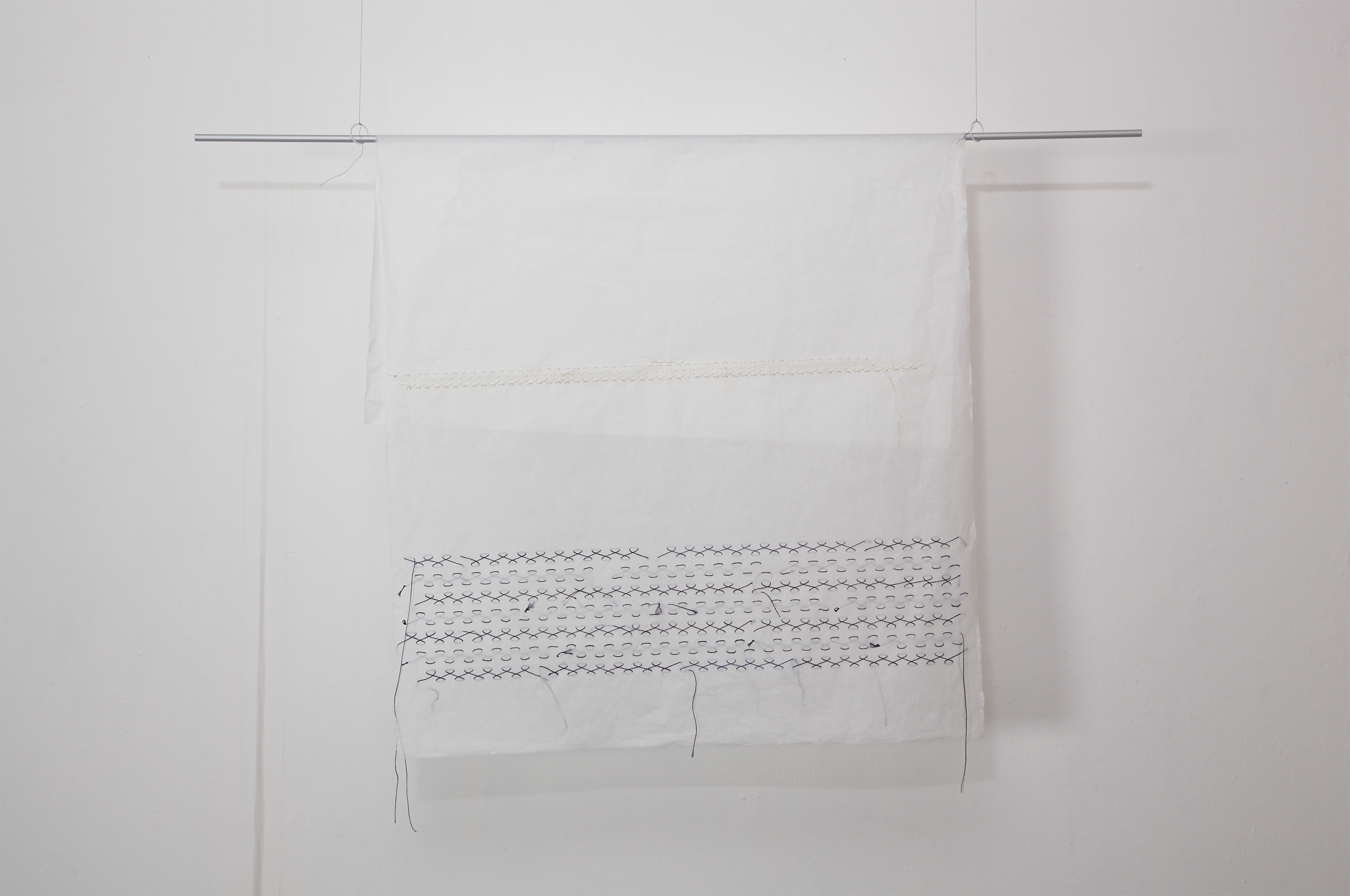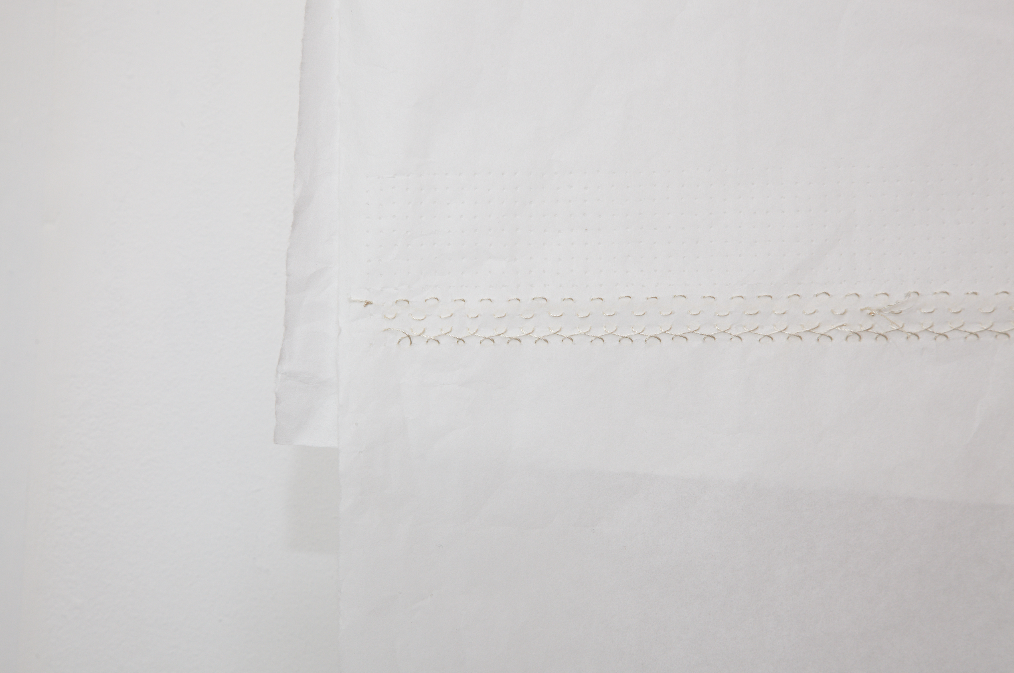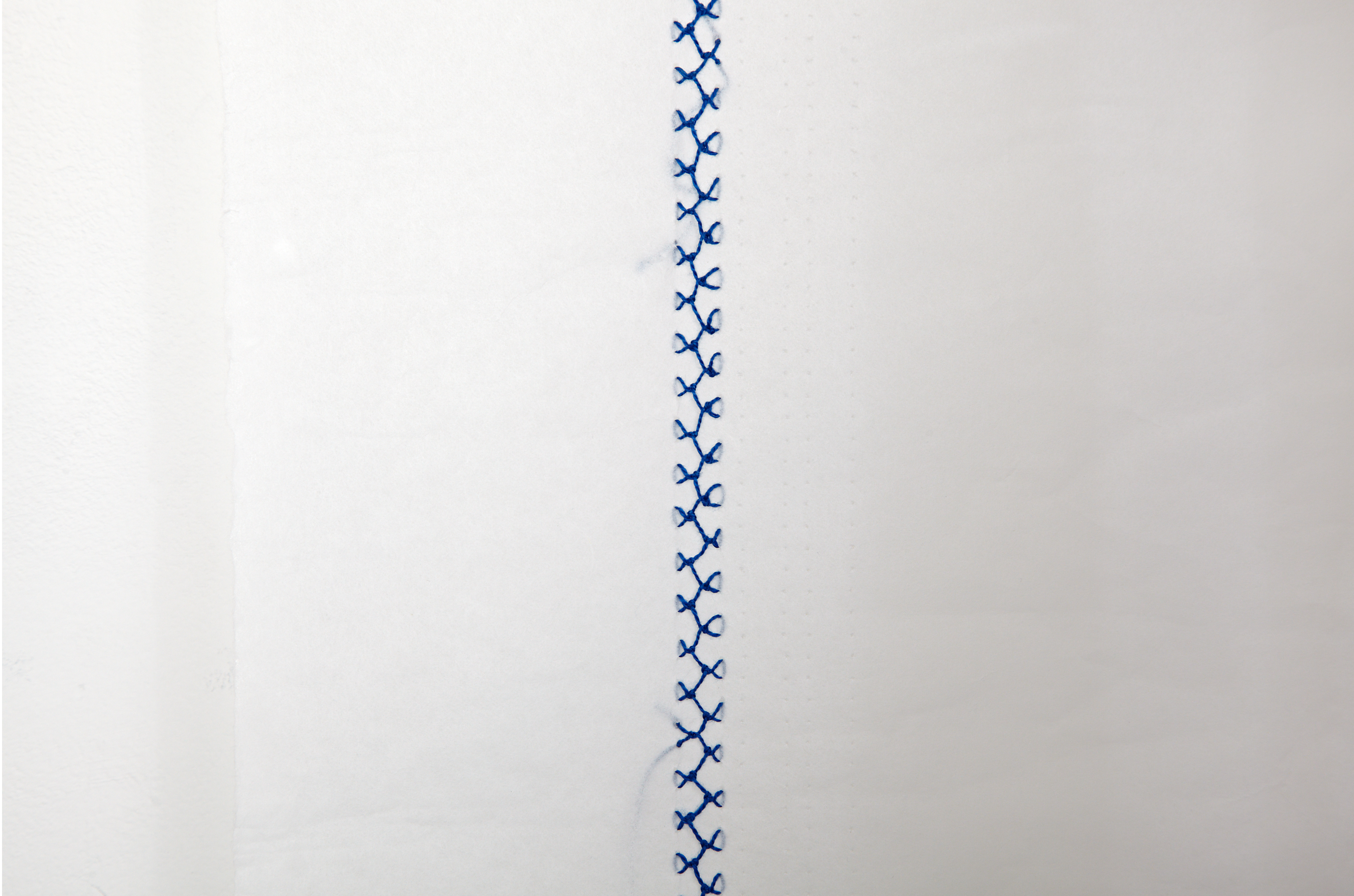 Couture de raccord, 2018. Installation detail. Stitch: Reconfigured antique seam/Surjet antique (couture de raccord). Polyester thread and Washi (Japanese paper), Kozo (mulberry).