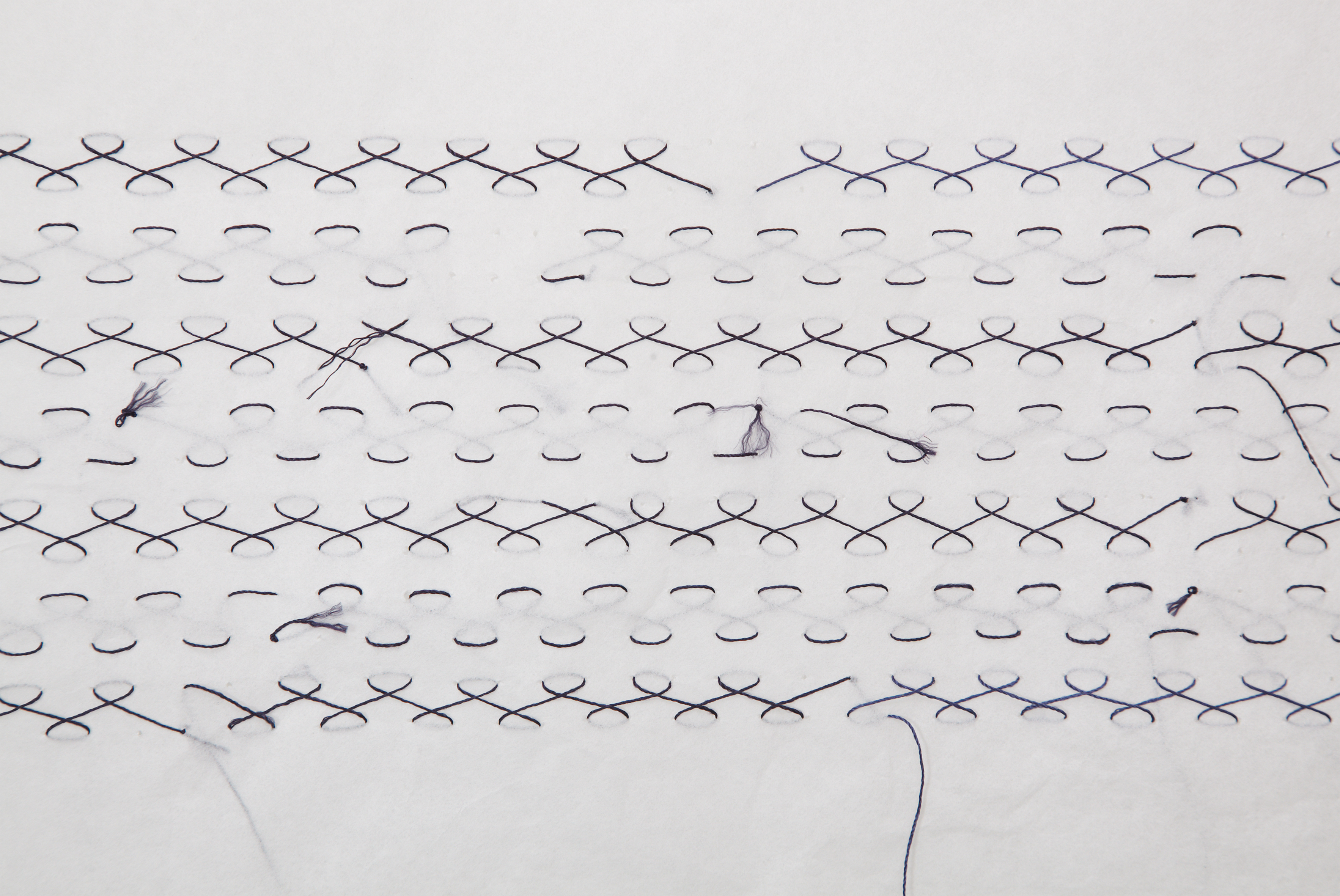 Point de chausson, 2018. Installation detail. Stitch: Herringbone stitch (front and back)/Point de chausson (endroit et envers). Silk thread and Washi (Japanese paper), Kozo (mulberry).