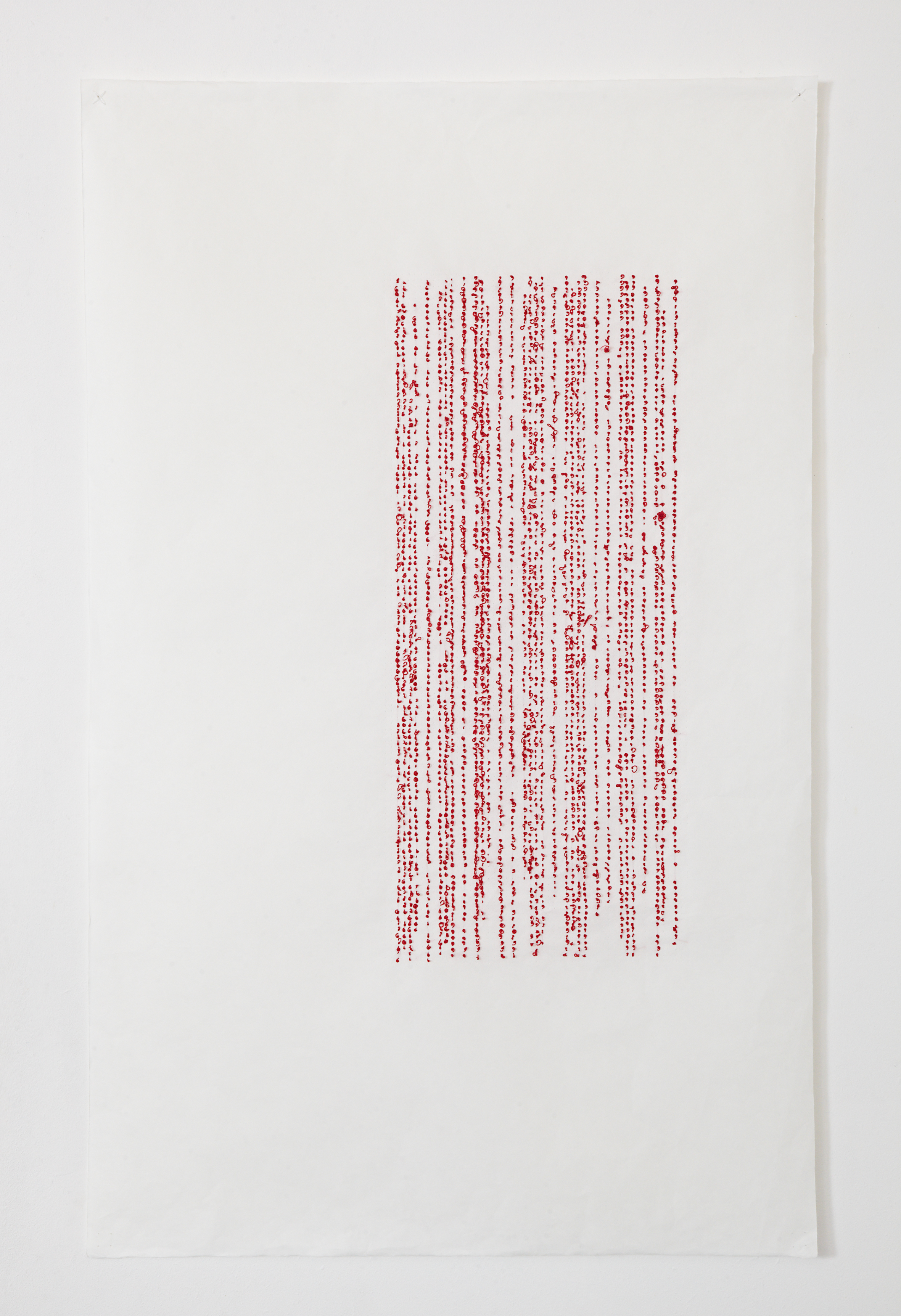 Red knots, 2019. Wall piece. Stitch: French knot/Point d’armes noué. Washi (Japanese paper), Kozo (mulberry); DMC Broder Spécial, cotton embroidery thread; dressmaking steel pins. 0m97 H x 0m60 W x 0m03D