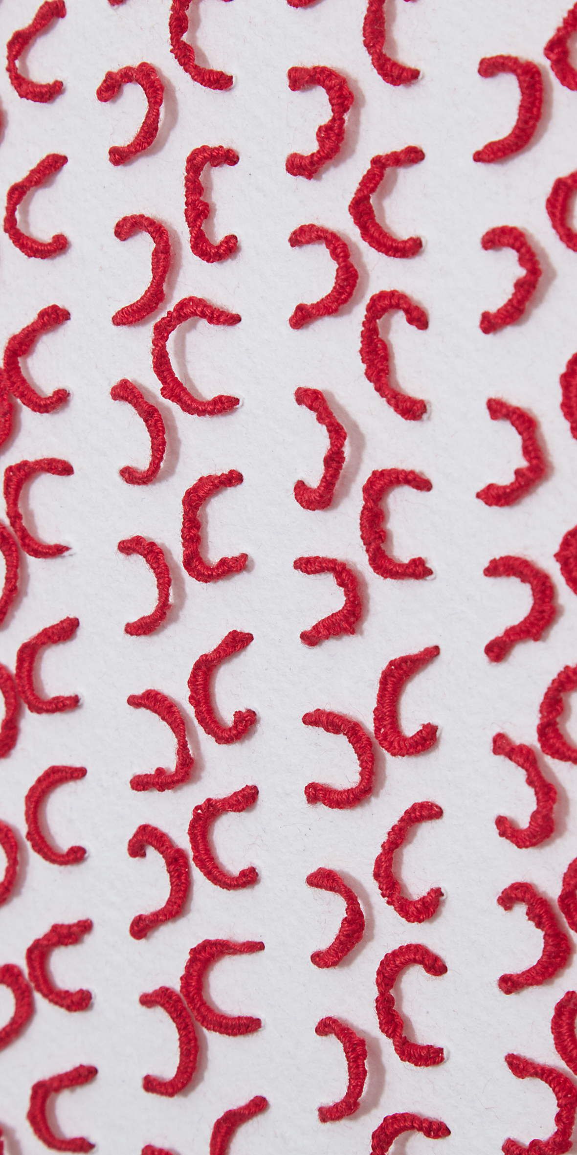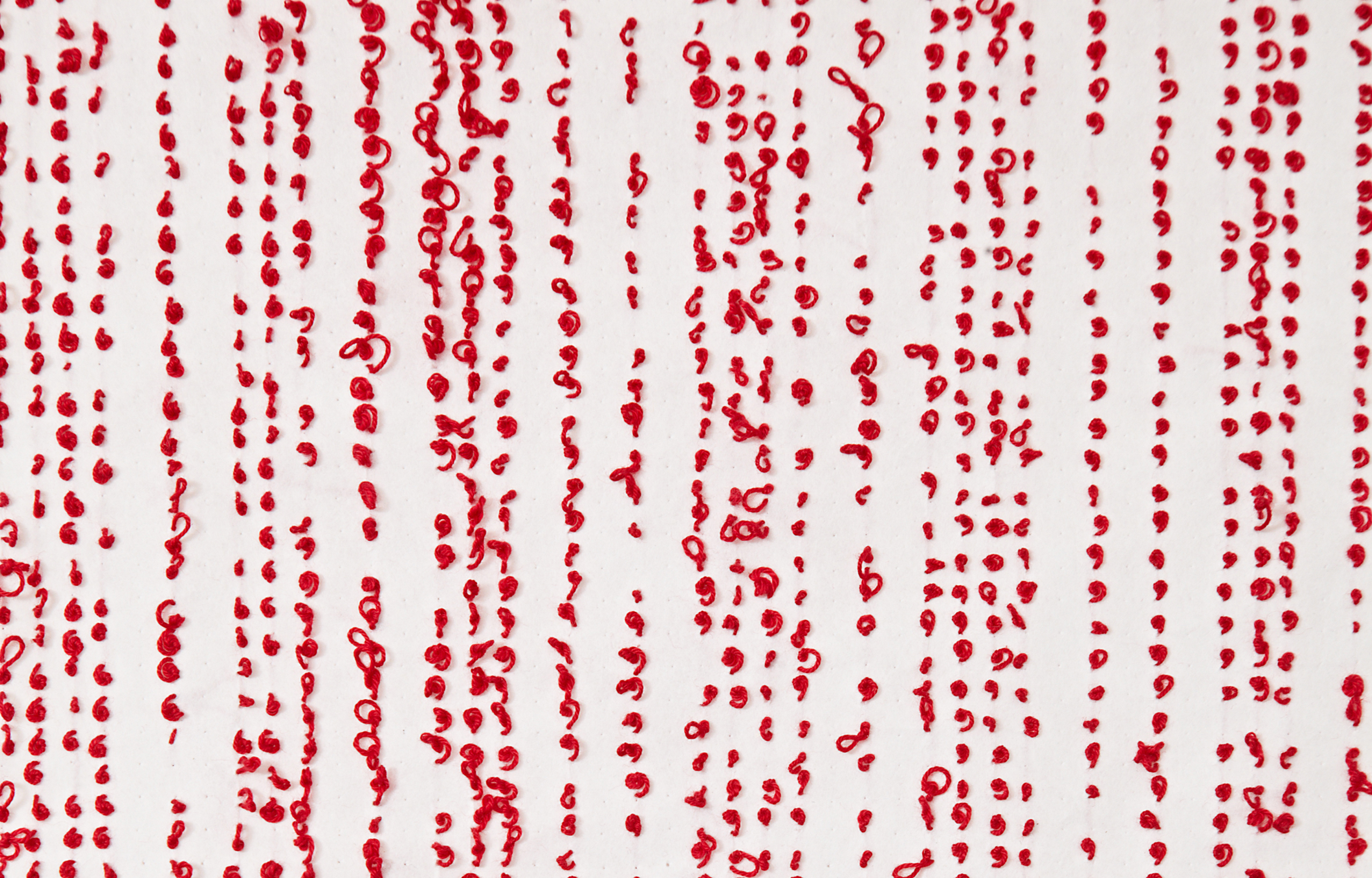Red knots, 2019. Wall piece. Stitch: French knot/Point d’armes noué. Photo © Carl Fox, Photography