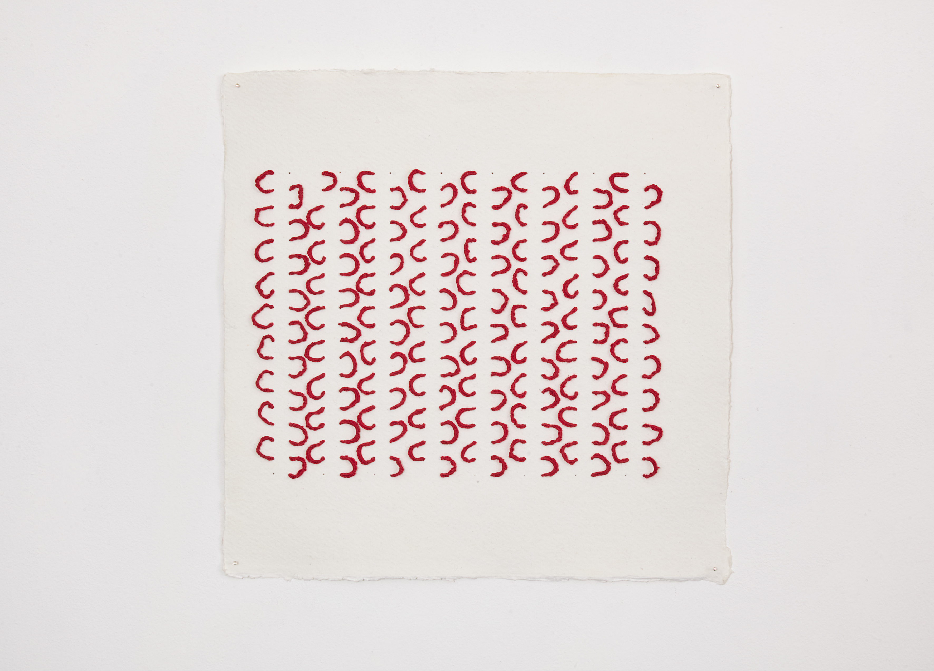 Red loops, 2019. Wall piece. Stitch: Button loop blanket stich/Point de bride festonnée. Khadi paper (cotton, India); DMC Broder Spécial, cotton embroidery thread; ink; dressmaking steel pins. 0m31 square