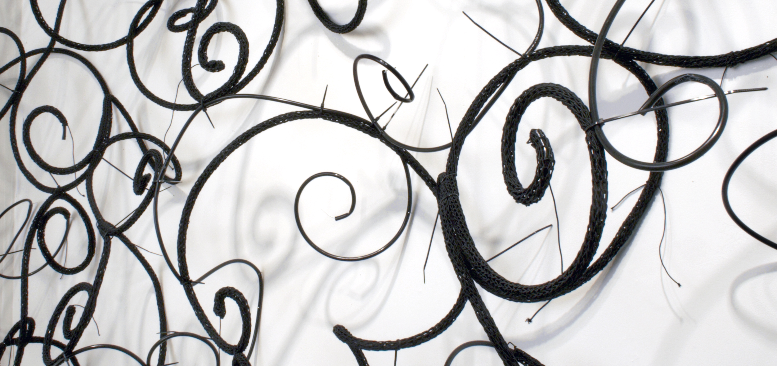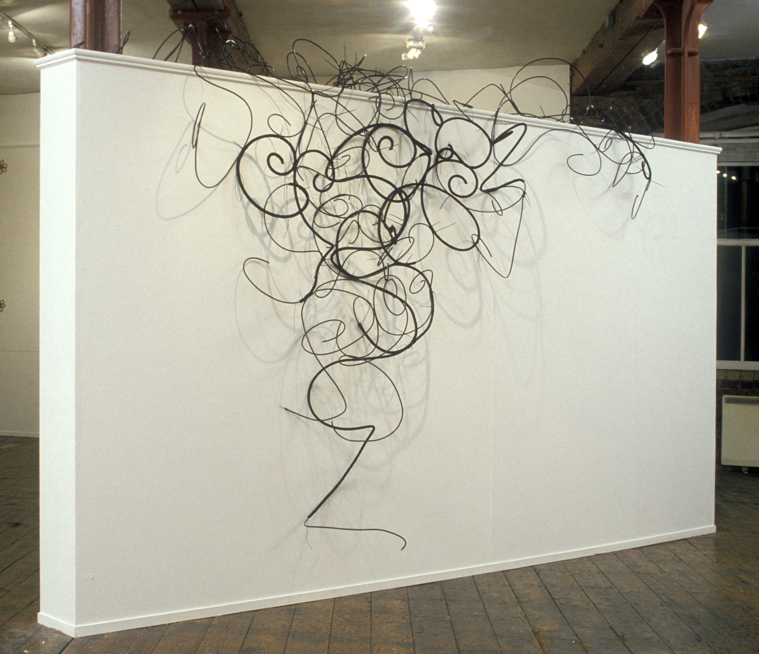 arabesques, 2006. Site specific installation for solo exhibition joie de faire at the Menier Gallery, London. Black irrigation pipe, galvanised wire, cable ties, French (spool) knitted black elastic cord, pins. 2m80 H x 4m53 W x 2m40 D.