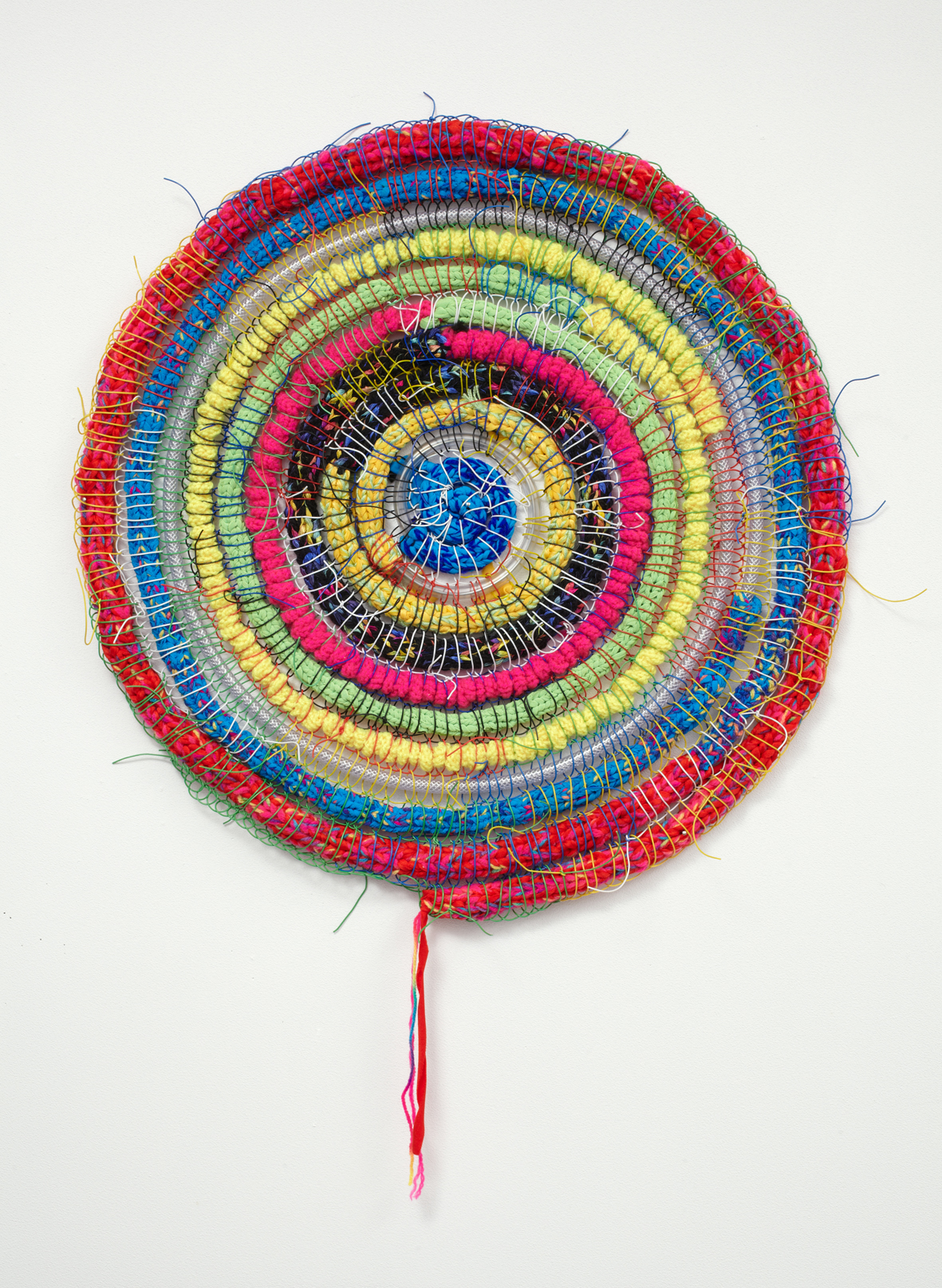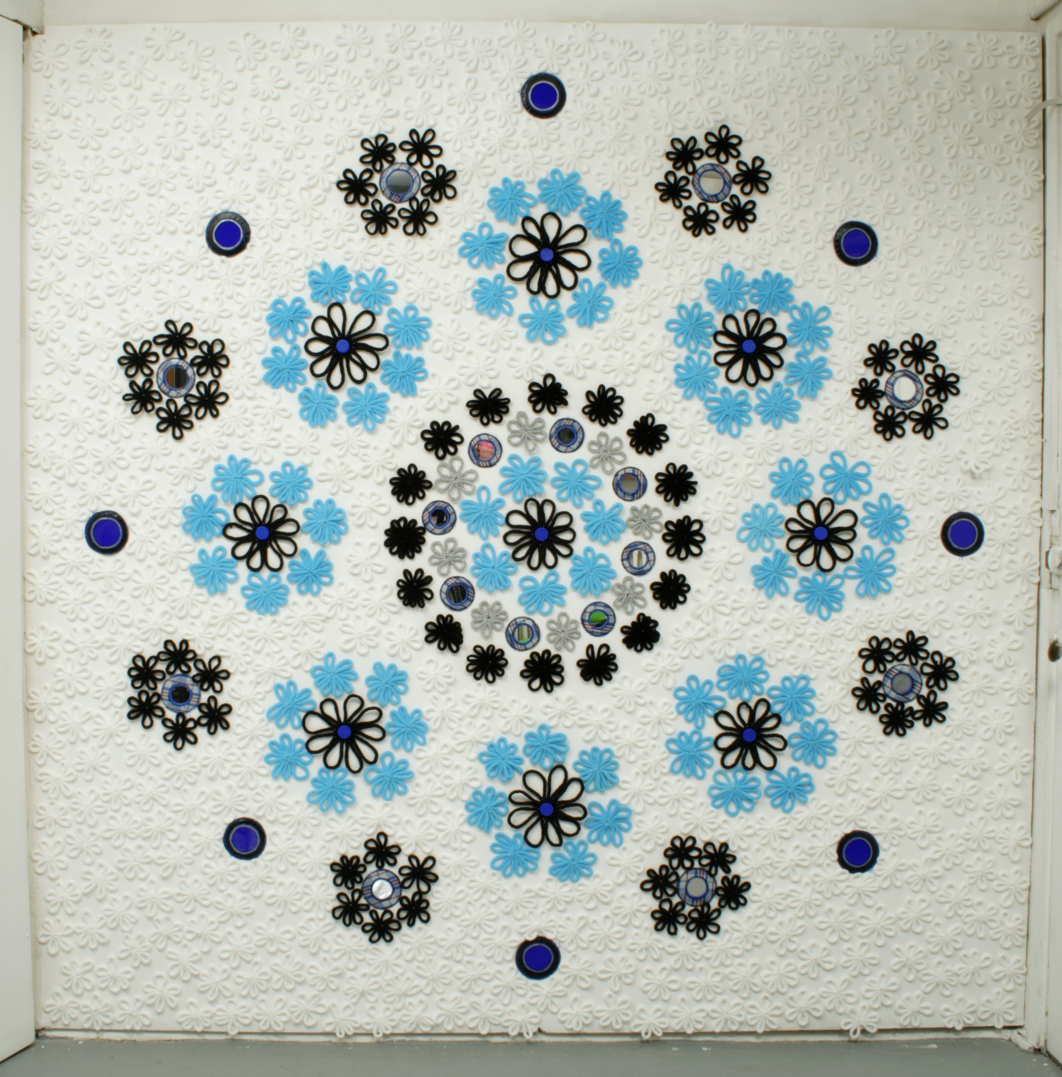 French (spool) knitted nylon and elastic, mirror and glass discs, acrylic discs, blue plastic bottle tops, bead and sequin pins, woven and printed carrier bags. 2m20 H x 2m45 W x 0m03 D