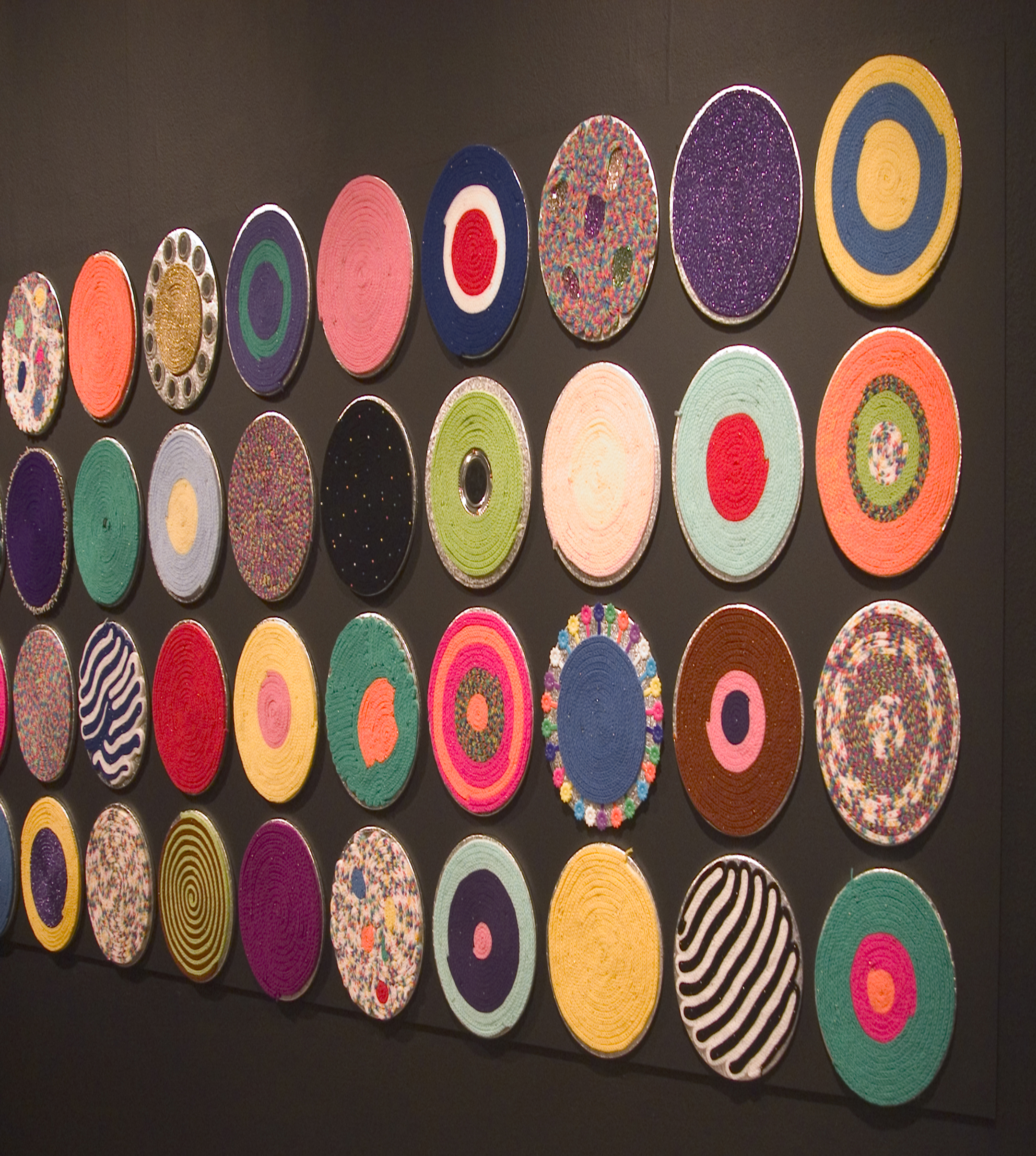 Placed in a grid-like pattern, the installation evokes the simplicity and repetitiveness of the knitting activity. Between painting and sculpture the installation subverts the seriality of minimalism and engages with issues around the nature and context of art production.